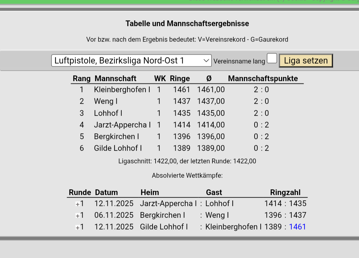 Die Tabelle und alle Ergebnisse finder ihr hier unter “Luftpistole Bezirksliga Nord-Ost 1”: https://mobile.rwk-melder.de/bezobb/index.php?fn=table